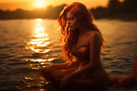The image depicts a sense of tranquility and wonder, as the mermaid peacefully navigates the gentle waves. The golden hues of the setting sun create a warm and serene atmosphere, adding to the ethereal allure of the scene.