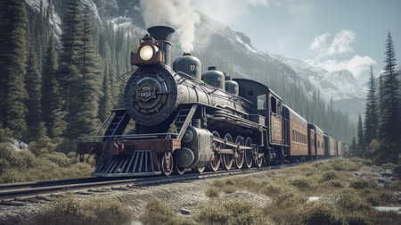 Vintage steam locomotive on the railroad tracks. retro style. Generative AI.