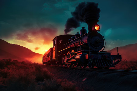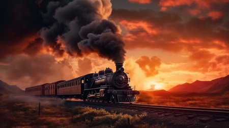 A majestic vintage steam train chugs through a vibrant autumn landscape, its journey illuminated by the golden hues of sunset.