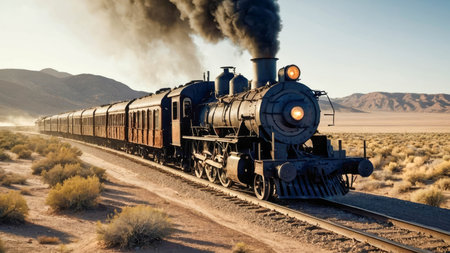 A mighty steam-powered train thunders along desert tracks, surrounded by rocky formations and morning light.
