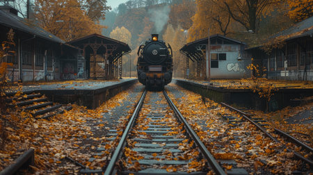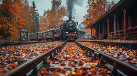 A nostalgic steam train is seen at a charming, quaint station, surrounded by vibrant autumn leaves all around. Generative AI