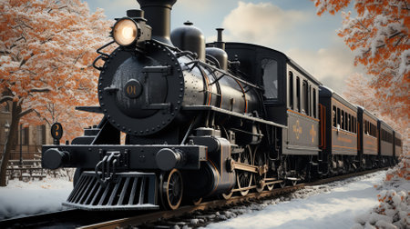 Black steam train traveling through snowy forest, decorated with warm glowing lights, symbolizing winter holidays, travel, and festive magic.