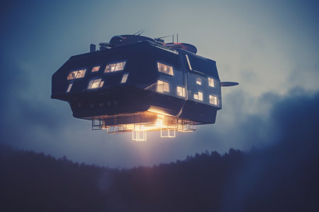 This illustration showcases the concept of AI-controlled flying homes, offering an imaginative vision of future urban living