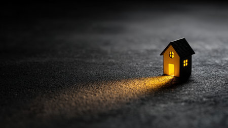 A small illuminated house model stands out against a dark textured surface, creating a captivating atmosphere of warmth and solitude, perfect for illustrating the concept of home.