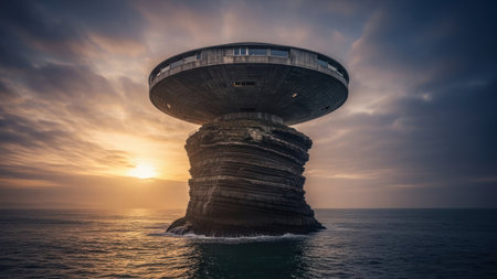 A unique modern building is situated atop a rugged rock formation emerging from the ocean. The image captures a serene sunset casting a warm glow across the sky and water. The composition highlights the contrast between the man-made structure and natural elements, creating a striking visual.