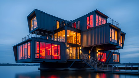 A striking modern home constructed from stacked shipping containers, situated on the waterfront. The structure features large windows that reflect the warm interior lighting, creating a cozy ambiance. The home is supported by stilts, giving it an elevated position over the water. The exterior is painted in a sleek dark color, contrasting with the vibrant red and orange lights inside. The design is both innovative and eco-friendly, showcasing a unique architectural style.