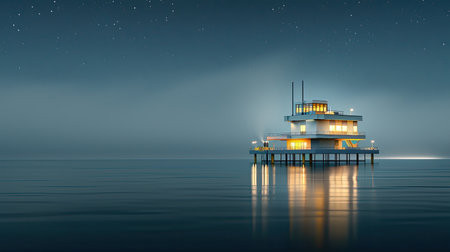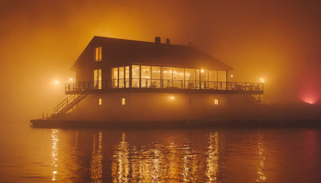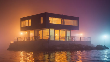 Night view of a modern building on the sea in the fog.