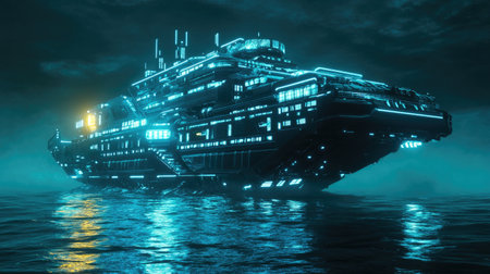 A striking futuristic spaceship glows with neon lights against dark ocean waters, creating a captivating scene of technological imagination and serene beauty.