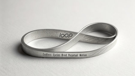Sleek metallic infinity loop with engraved text embodies continuous cycles, showcasing perpetual motion, perfect for branding and innovative concepts.