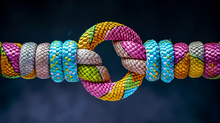 Vividly colored ropes intricately knotted showcasing strength, unity, and complexity. Colorful knotted ropes symbolizing strength, unity