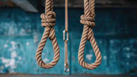 Close-up view of two knotted ropes suspended in a rugged setting. The blue textured background enhances the raw appeal, making it ideal for topics on strength and adventure.