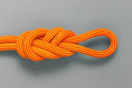 Orange climbing rope on a grey background. Safety knot. The knot the eight for safety.