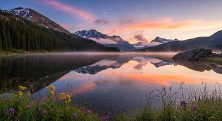 Mountain lake in the morning mist, Canadian Rockies, Alberta, Canada