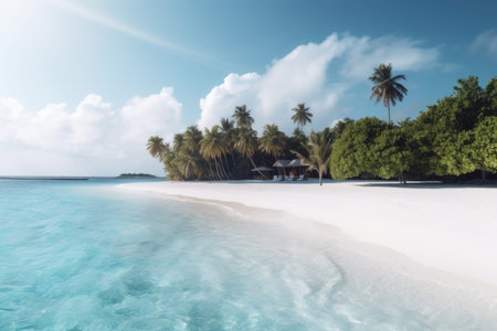 Breathtaking view of pristine white sand beach in Maldives. Turquoise waters of Indian Ocean lap gently at shore, creating serene idyllic scene. Sky is vibrant blue, dotted with fluffy white clouds
