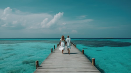 Young couple walking on a wooden pier over turquoise sea in Maldives