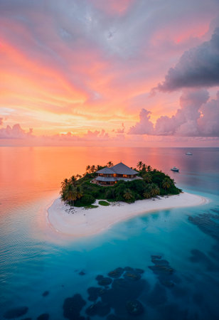 A small tropical island showcases pristine white sands and palm trees, surrounded by crystal clear waters.