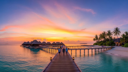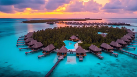 Tranquil sunset illuminating luxury overwater bungalows in crystal-clear turquoise waters of the Maldives