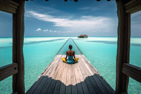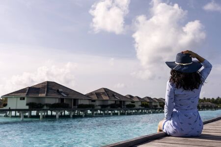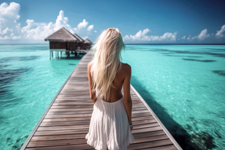 Young woman walking on a wooden pier in the maldives, with turquoise water and overwater bungalows