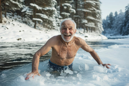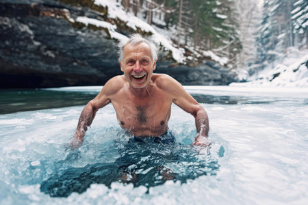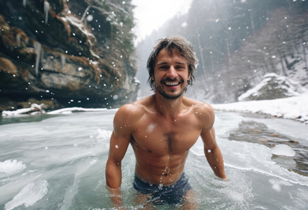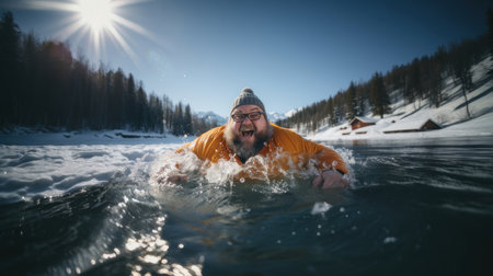 Exhilarating moment as a cheerful man, wearing a winter hat, enjoys swimming in an icy mountain river, surrounded by a snowy landscape and sunny sky.