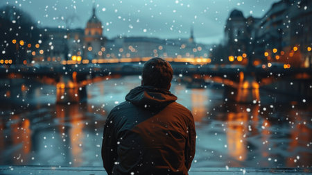 Generative AI Image of Man Wearing Warm Clothes Standing on Edge Bridge with Bokeh Lights in Winter