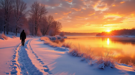 A lone figure embraces the beauty of a wintry landscape, gazing at the fiery sky as the serene waters reflect the fading light of the setting sun