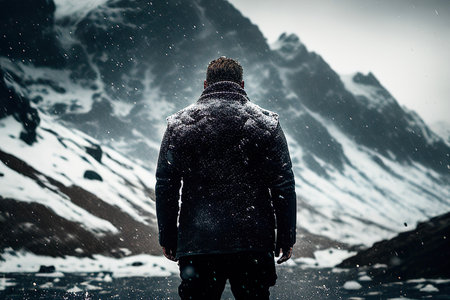 brave businessman an epic ivernal mountain, snow rain, tunes, adverse weather