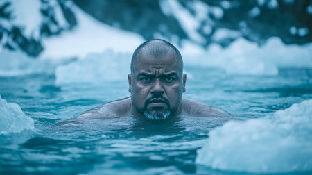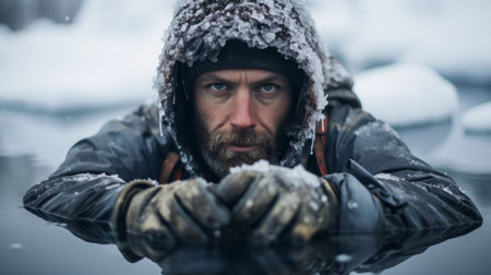 Man with beard immersing in icy water on winter day. Frigid aqua hole male. Generate Ai