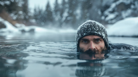 A person submerged in a freezing forest pond surrounded by frostcovered trees