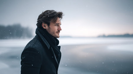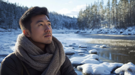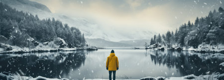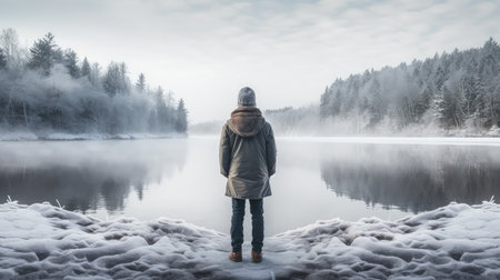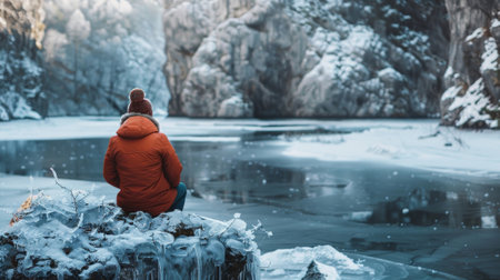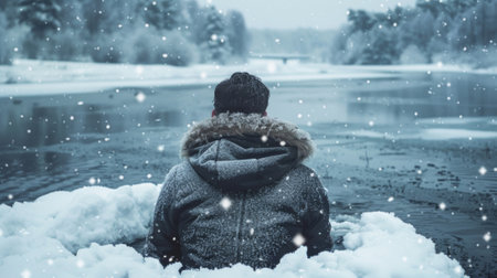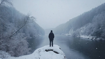 A solitary figure in winter attire gazes over a serene snowy river landscape, capturing the essence of solitude, nature, and introspection in the cold season