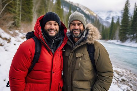 Active middle aged interracial gay couple hiking outdoors, winter season outdoors