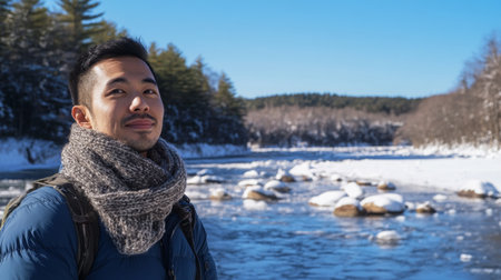 A man enjoying a winter day by a snowy river in a picturesque landscape with clear skies