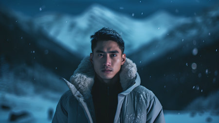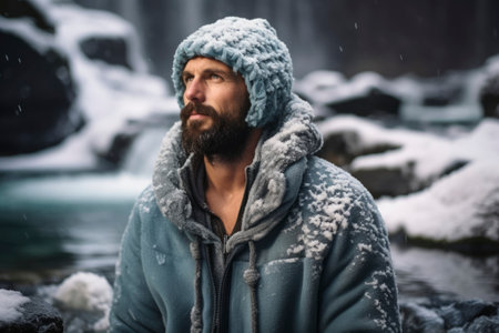 Determined middle-aged caucasian man braving harsh winter conditions in snowy snowstorm. Showcasing his rugged. Snow-covered beard and intense gaze while wearing winter clothing with fur hood