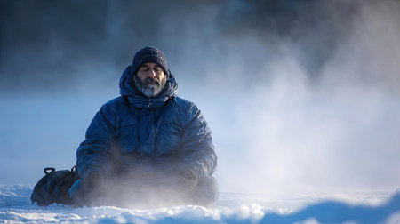 A solitary man sits in a serene winter landscape, meditating amid piles of snow with steam rising, embracing the tranquility of nature.