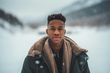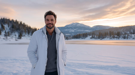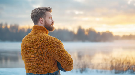 Generative AI Image of Man Wearing Warm Clothes Standing at Lake with Bokeh Lights in Winter
