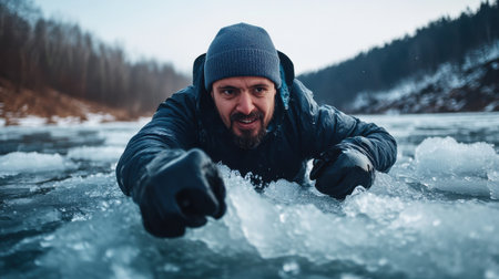 Humorous moment of a man bravely swimming in a frozen icy lake, showcasing winter sport adventure and extreme cold challenge.