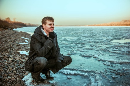 strong motivation. man crouched in a strong position. winter. on the background of frozen river.