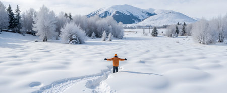 Solitary figure in winter landscape, surrounded by snow covered trees and river, evoking emotions of solitude and peace in a serene snowy environment
