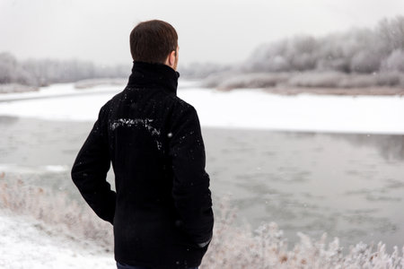 Man in a black coat standing on a white snowy shore of a river. Winter day with frozen weather. Human and strong nature.