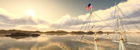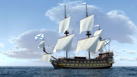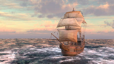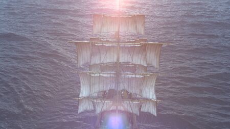 Sailing ship in the sea. 3d render. Vintage style.