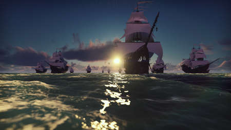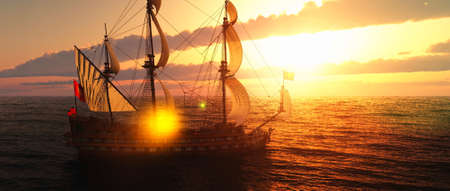 Pirate ship sailing on the ocean at sunset. Retro adventure