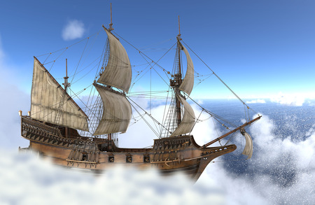 3D illustration sailboat flying above the clouds