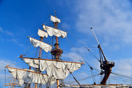Detail of the rigging of an old wooden sailing ship against blue sky