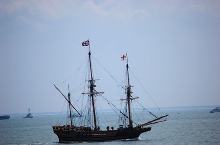 The Susan Constant, Godspeed and Discovery, re-creations of the three ships that brought English colonists to Virginia in 1607, flying the English and Union Jack flags and sailing down the James River on May 12, 2007, as part of the 400th Anniversary prog