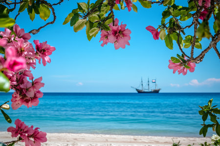 Stunning beach scene in alpharetta with vibrant flowers, clear sky, and distant ship