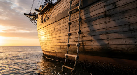 old wooden vintage pirate ship on sea water surface in sunset evening romantic time with yellow light from soft focus lantern in overboard space