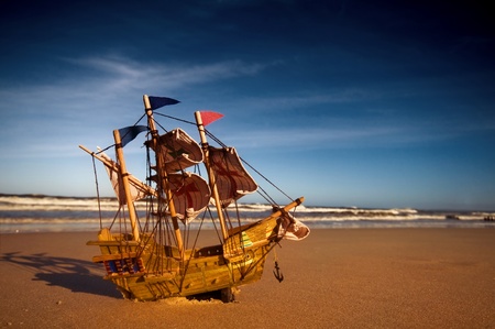 Ship model on summer sunny beach. Travel, voyage, vacation concepts