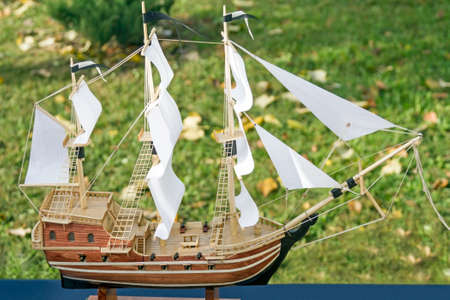 Old wooden ship with sails and masts toy on a stand. Vintage and retro toys