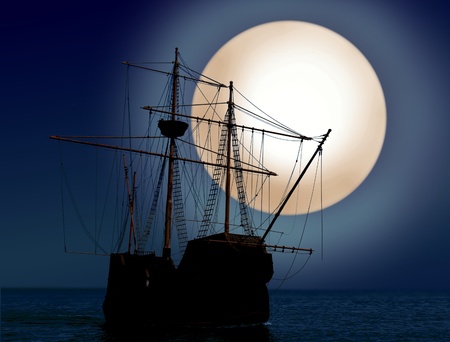 This is a replica of the ship Mayflower II. It demonstrates the first sailing in 1620 when the Pilgrims sailed to the New World. The ship shows full sails on a shimmering moonlit ocean against a dark blue night sky.