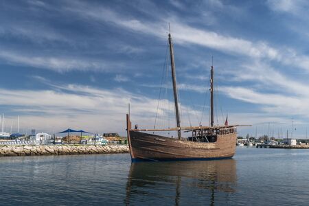 AL, PORTUGAL - JULY 22, 2018: Caravella Santa Maria is an exact replica of the famous caravel a traveler of Genoa Christopher Columbus.