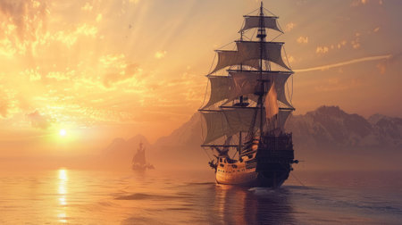 A detailed sailing ship with billowing sails glides effortlessly across tranquil waters as dawn breaks.